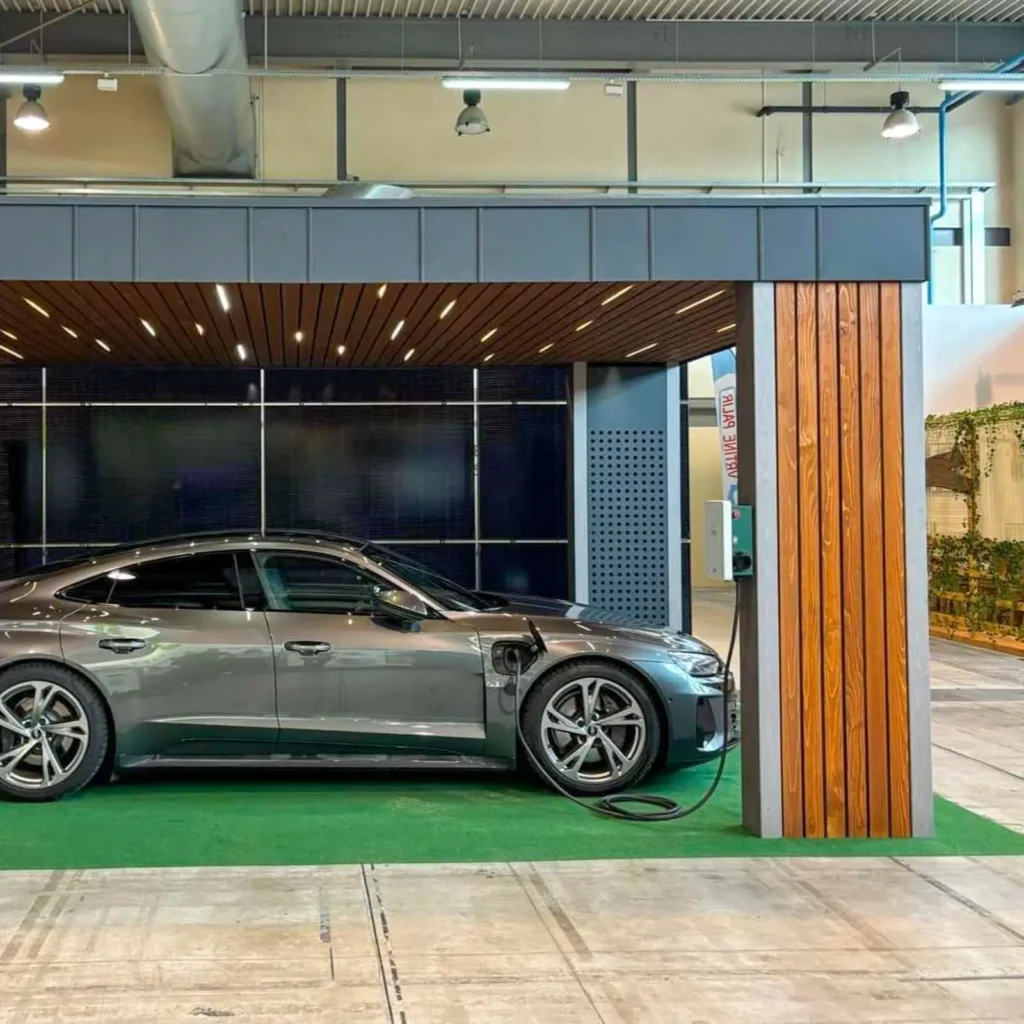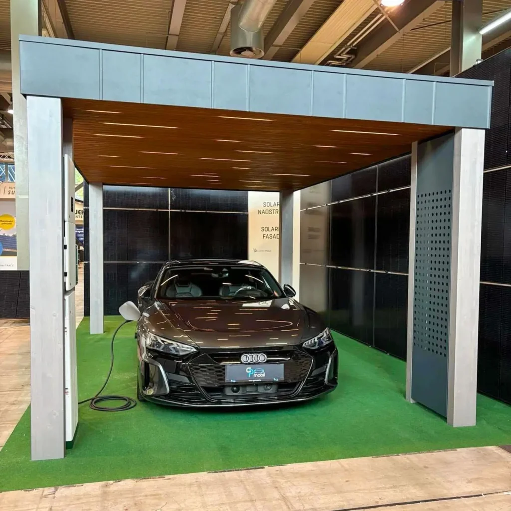 Lesen solarni nadstrešek je izdelan po meri ter vključuje sončno elektrarno za polnjenje električnega avtomobila ali napajanje vašega doma.